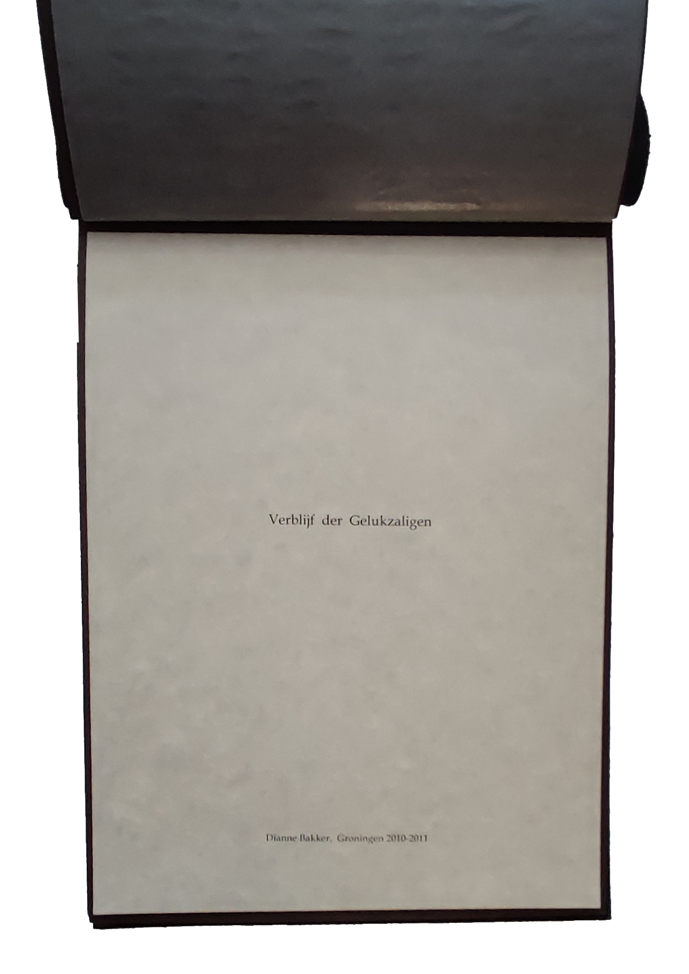 Het boek Verblijf der gelukzaligen is een geheel met de hand in serie gemaakt kunstwerk-in-boekvorm en kunstenaarsboek, waarvan de vierentwintig binnenwerk-bladen zijn gebonden als een ouderwets fotoalbum in een lederen omslag. Negentien bladen bestaan uit steeds verschillende onderdelen van verschillende materialen, die door naaiwerk zijn geassembleerd op een donkerbruin 300 grams houtvrij karton, dat telkens is voorzien van een pergamijnen dekblad. Aan deze bladen zijn enkele tekstbladen toegevoegd.