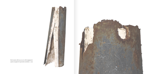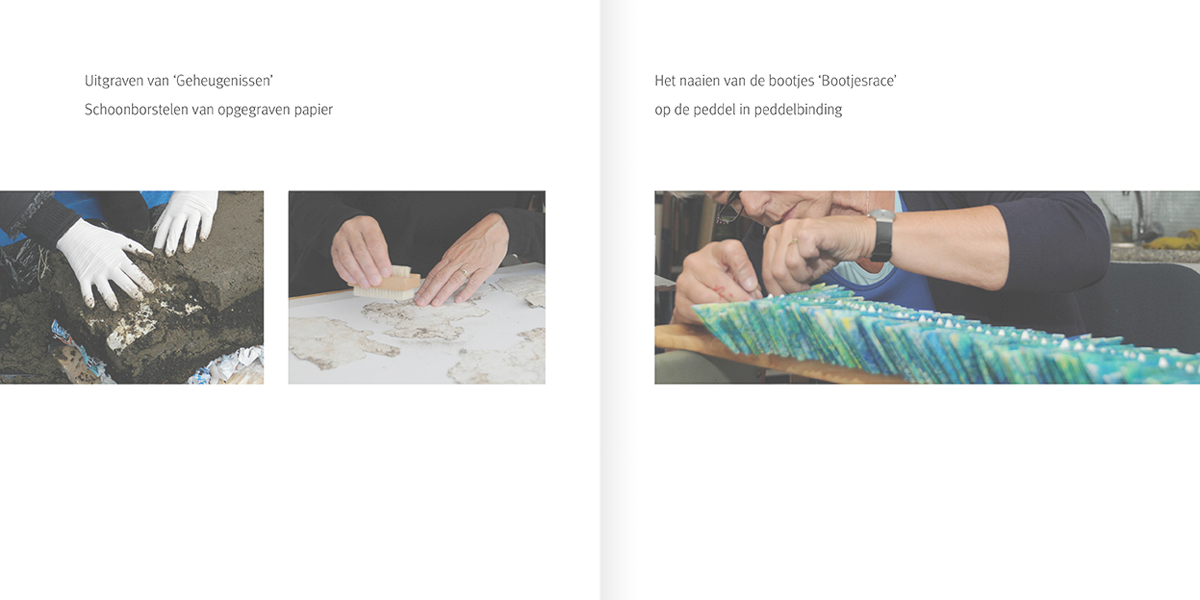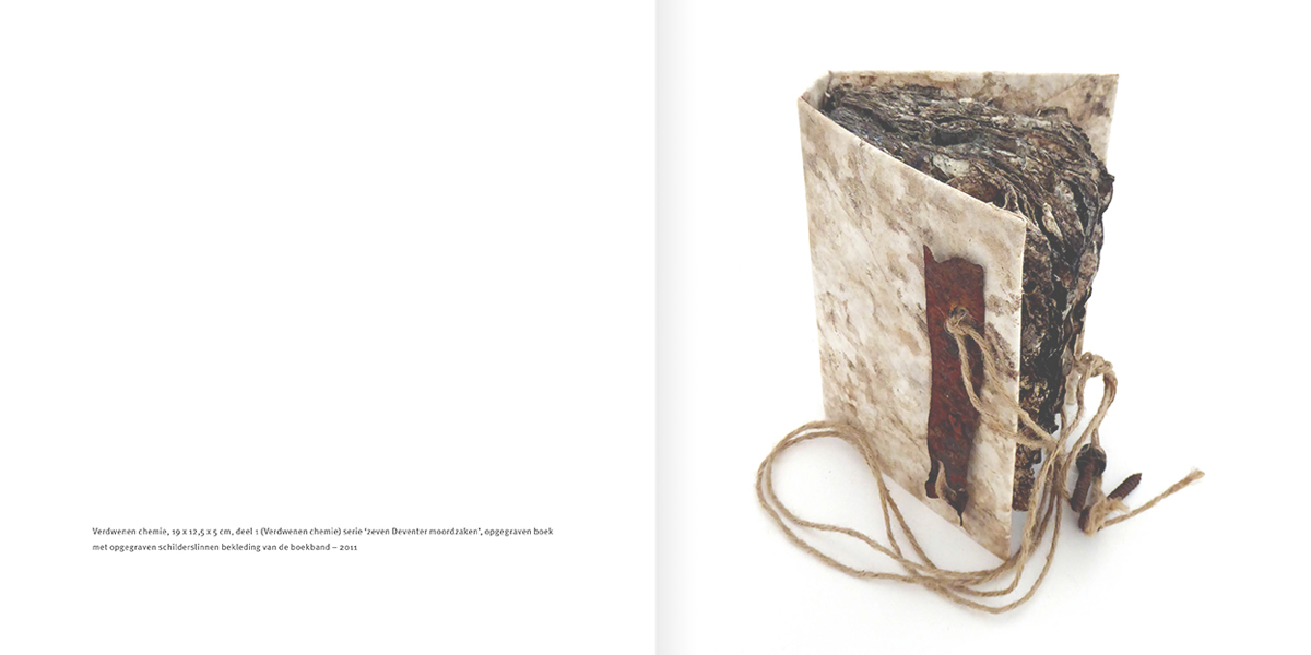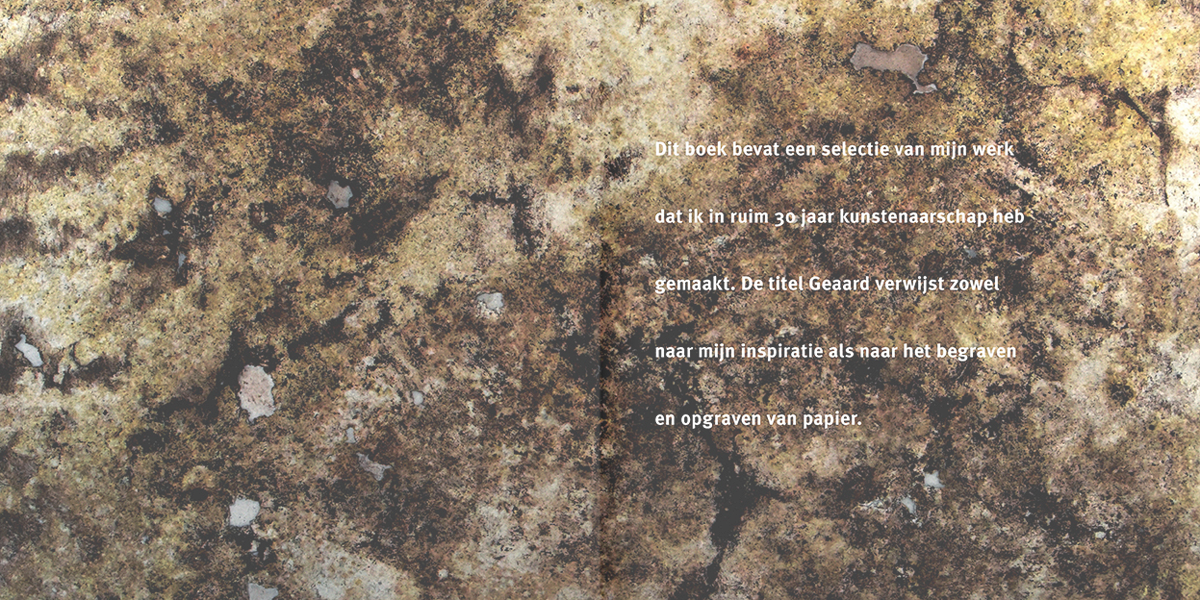 Zo heeft zij speciaal voor de luxe editie van de uitgave Geaard een aantal vellen wit aquarelpapier gedurende twee weken begraven in vochtige aarde. Na opgraving is het gedroogd en schoongeborsteld, en vervolgens is het zonder enige extra conserverende behandeling op de platten van het grijsbord van de boekband aangebracht.