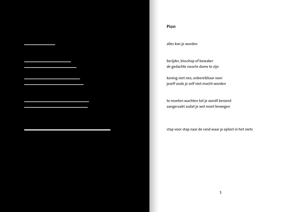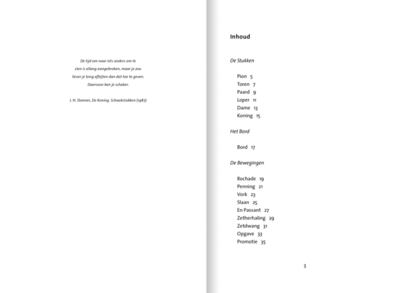 In zestien teksten, zoals Van Heumen zelf zijn gedichten noemt, karakteriseert hij de verschillende elementen van het schaakspel en dicht de stukken, het bord en de bewegingen een bonte rij eigenschappen toe en spreekt ze aan op wezen en gedrag.